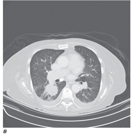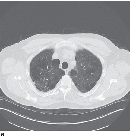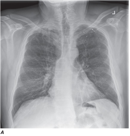 Computed tomography (CT) offers several advantages over routine chest radiography (Figs. C-1A, B and C-2A, B). First, the use of cross-sectional images allows distinction between densities that would be superimposed on plain radiographs. Second, CT is far better than routine radiographic studies at characterizing tissue density, distinguishing subtle density differences between adjacent structures, and providing accurate size assessment of lesions.