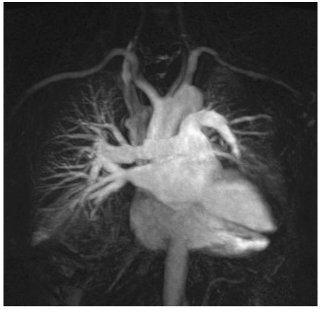 An advantage of MR is the use of nonionizing electromagnetic radiation. Additionally, MR is well suited to distinguish vascular from nonvascular structures without the need for contrast. Blood vessels appear as hollow tubular structures because flowing blood does not produce a signal on MR imaging. Therefore, MR can be useful in demonstrating pulmonary emboli, defining aortic lesions such as aneurysms or dissection, or other vascular abnormalities (Fig. C-5) if radiation and IV contrast medium cannot be used. Gadolinium can be used as an intravascular contrast agent for MR angiography (MRA); however, synchronization of data acquisition with the peak arterial bolus is one of the major challenges of MRA; the flow of contrast medium from the peripheral injection site to the vessel of interest is affected by a number of factors including heart rate, stroke volume, and the presence of proximal stenotic lesions.