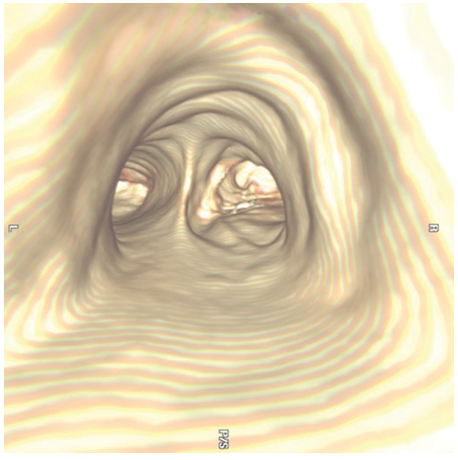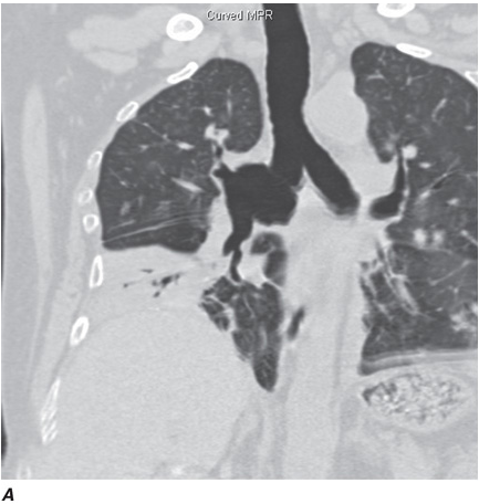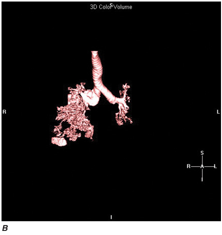 Recent advances in computer processing have allowed the development of helical CT scanning. Helical CT technology results in faster scans with improved contrast enhancement and thinner collimation. The image is obtained during a single breath-holding maneuver that allows less motion artifact. In addition, helical CT scanning allows the collection of continuous data over a larger volume of lung than is possible with conventional CT. Data from the imaging procedure can be reconstructed as images in planes other than the traditional cross-sectional (axial) view, including coronal, or sagittal planes (Fig. C-3A). Finally, sophisticated volumetric “3D” representations of structures can be produced (Fig. C-3B) including the ability to perform a virtual bronchoscopy, mimicking direct visualization through a bronchoscope (Fig. C-4).