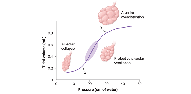 Once the patient has been intubated, the basic principles of applying MV are to optimize oxygenation while avoiding overstretch and collapse/rerecruitment ventilator-induced lung injury (VILI). This concept, which is illustrated in Fig. 269-1, has gained acceptance because of important empirical and experimental evidence linking high airway pressures and volumes and overstretching the lung with collapse/rerecruitment with poor outcomes. Although normalization of pH through elimination of CO2 is desirable, the risk of lung damage associated with the large volume and high pressures needed to achieve this goal has led to the acceptance of permissive hypercapnia. This approach has been found to be well tolerated when care is taken to avoid excess acidosis by pH buffering.