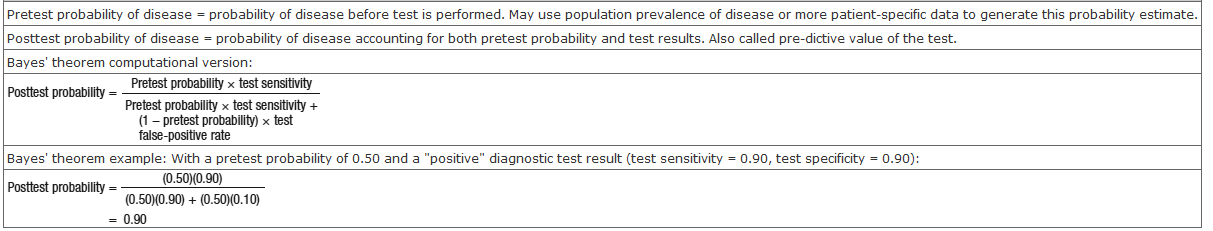 Unfortunately, there are no perfect tests. After every test is completed, the true disease state of the patient remains uncertain. Quantifying this residual uncertainty can be done with Bayes’ theorem. This theorem provides a simple mathematical way to calculate the posttest probability of disease from three parameters: the pretest probability of disease, the test sensitivity, and the test specificity (Table 3-2). The pretest probability is a quantitative expression of the confidence in a diagnosis before the test is performed. In the absence of more relevant information, it is usually estimated from the prevalence of the disease in the underlying population. For some common conditions, such as CAD, nomograms and statistical models have been created to generate better estimates of pretest probability from elements of the history and physical examination. The posttest probability, then, is a revised statement of the confidence in the diagnosis, taking into account what was known both before and after the test.