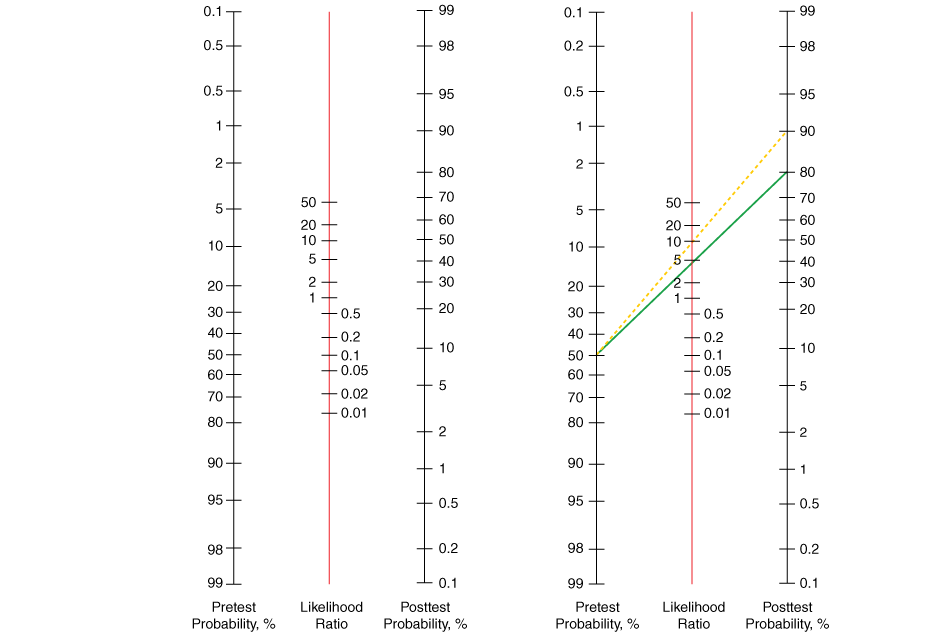 Nomogram version of Bayes’ theorem used to predict the posttest probability of disease (right-hand scale) using the pretest probability of disease (left-hand scale) and the likelihood ratio for a positive test (middle scale). See text for information on calculation of likelihood ratios. To use, place a straightedge connecting the pretest probability and the likelihood ratio and read off the posttest probability. The right-hand part of the figure illustrates the value of a positive exercise treadmill test (likelihood ratio 4, green line) and a positive exercise thallium single-photon emission CT perfusion study (likelihood ratio 9, broken yellow line) in a patient with a pretest probability of coronary artery disease of 50%.