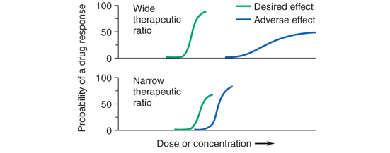 The concept of a therapeutic ratio. Each panel illustrates the relationship between increasing dose and cumulative probability of a desired or adverse drug effect. Top. A drug with a wide therapeutic ratio, i.e., a wide separation of the two curves. Bottom. A drug with a narrow therapeutic ratio; here, the likelihood of adverse effects at therapeutic doses is increased because the curves are not well separated. Further, a steep dose-response curve for adverse effects is especially undesirable, as it implies that even small dosage increments may sharply increase the likelihood of toxicity. When there is a definable relationship between drug concentration (usually measured in plasma) and desirable and adverse effect curves, concentration may be substituted on the abscissa. Note that not all patients necessarily demonstrate a therapeutic response (or adverse effect) at any dose, and that some effects (notably some adverse effects) may occur in a dose-independent fashion.