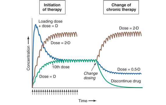 Drug accumulation to steady state. In this simulation, drug was administered (arrows) at intervals = 50% of the elimination half-life. Steady state is achieved during initiation of therapy after ~5 elimination half-lives, or 10 doses. A loading dose did not alter the eventual steady state achieved. A doubling of the dose resulted in a doubling of the steady state but the same time course of accumulation. Once steady state is achieved, a change in dose (increase, decrease, or drug discontinuation) results in a new steady state in ~5 elimination half-lives.