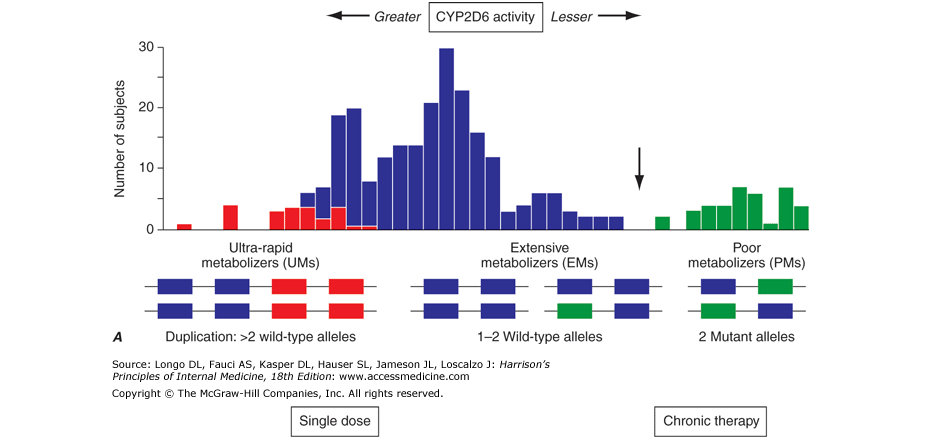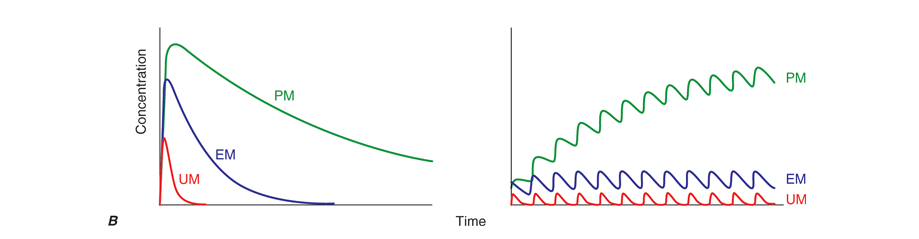 Note: PM, poor metabolizer (homozygote for reduced or loss of function allele); EM, extensive metabolizer: normal enzymatic activity; UM, ultra-rapid metabolizer (enzymatic activity much greater than normal, e.g., with gene duplication, Fig. 5-6).
