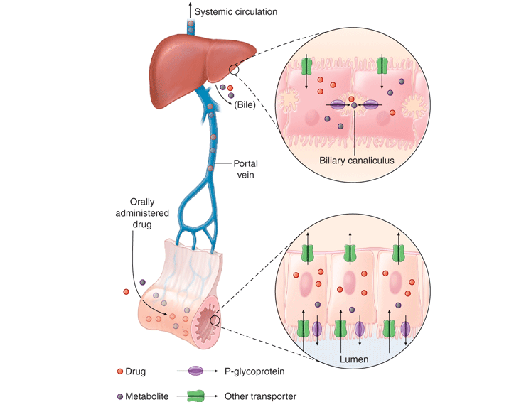 When a drug is administered orally, it must traverse the intestinal epithelium, the portal venous system, and the liver prior to entering the systemic circulation (Fig. 5-3). Once a drug enters the enterocyte, it may undergo metabolism, be transported into the portal vein, or undergo excretion back into the intestinal lumen. Both excretion into the intestinal lumen and metabolism decrease systemic bioavailability. Once a drug passes this enterocyte barrier, it may also be taken up into the hepatocyte, where bioavailability can be further limited by metabolism or excretion into the bile. This elimination in intestine and liver, which reduces the amount of drug delivered to the systemic circulation, is termed presystemic elimination, presystemic extraction, or first-pass elimination.