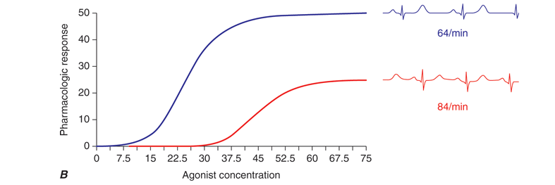 A. The efflux pump P-glycoprotein excludes drugs from the endothelium of capillaries in the brain, and so constitutes a key element of the blood-brain barrier. Thus, reduced P-glycoprotein function (e.g., due to drug interactions or genetically determined variability in gene transcription) increases penetration of substrate drugs into the brain, even when plasma concentrations are unchanged. B. The graph shows an effect of a β1-receptor polymorphism on receptor function in vitro. Patients with the hypofunctional variant (red) may display lesser heart-rate slowing or blood pressure lowering on exposure to a receptor blocking agent.
