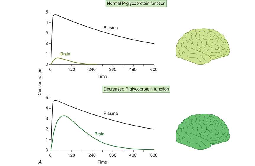 Animal models have suggested, and clinical studies are confirming, that limited drug penetration into the brain, the “blood-brain barrier,” often represents a robust P-glycoprotein–mediated efflux process from capillary endothelial cells in the cerebral circulation. Thus, drug distribution into the brain may be modulated by changes in P-glycoprotein function.