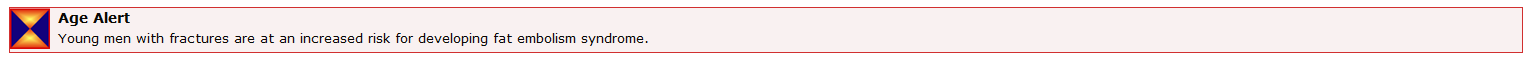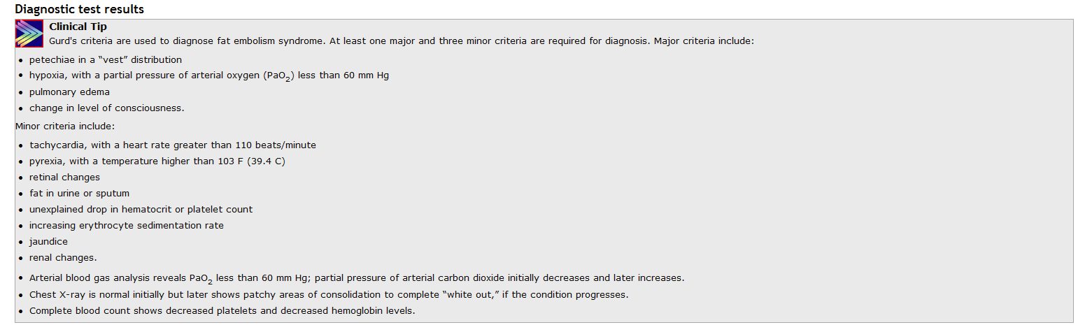 Fat embolism syndrome is a rare but potentially fatal problem. The syndrome involves pulmonary, cerebral, and cutaneous manifestations and occurs 24 to 48 hours postinjury.